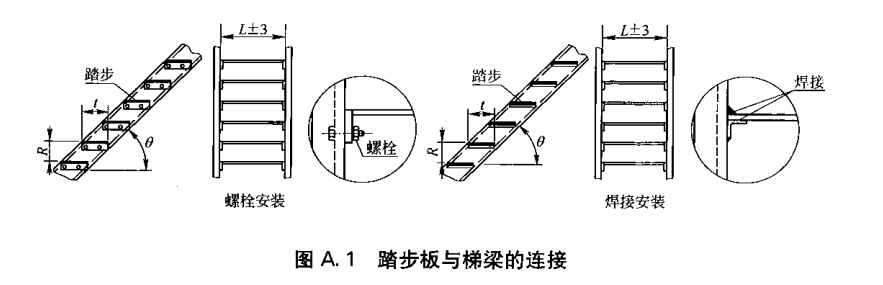 (8)踏步板與樓梯的鏈接采用焊接或螺栓固定,見圖A.1。采用螺栓固定時,螺栓規格不得小于M10。